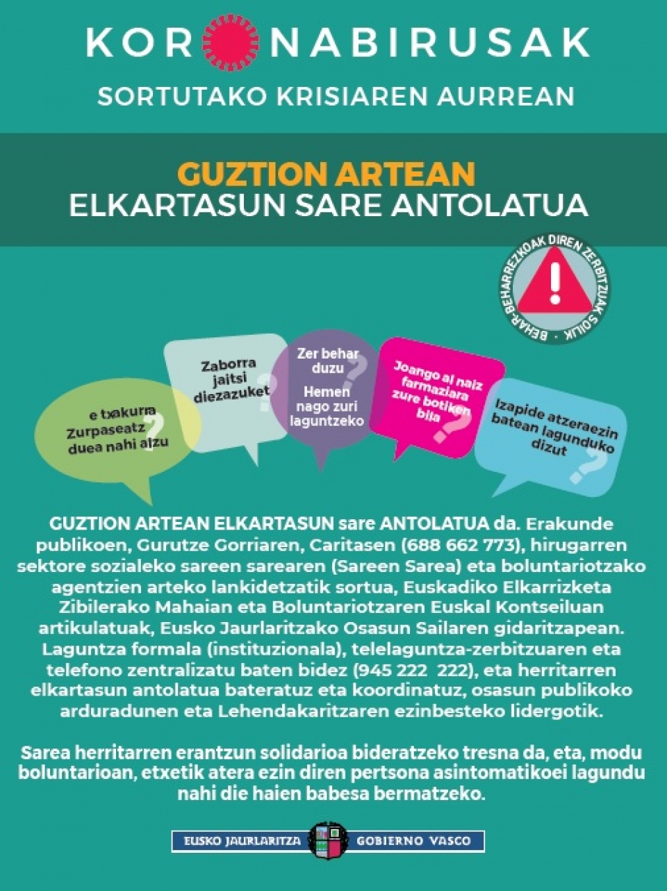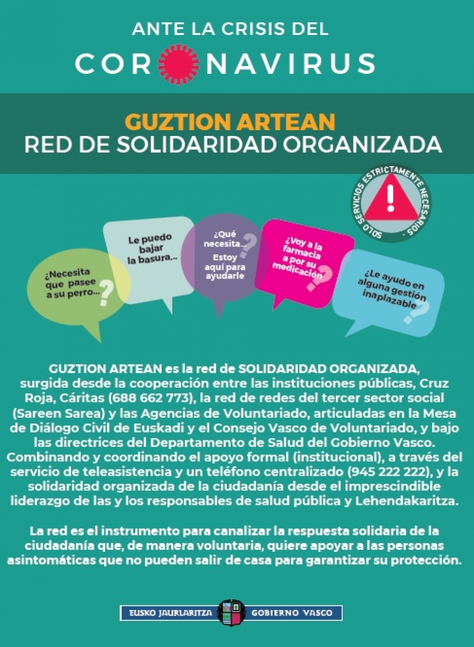 Tanto si eres una persona mayor de 70 años y/o dependiente, sin síntomas (febrícula o síntomas respiratorios, especialmente tos seca o dificultad respiratoria), careces de apoyo familiar y necesitas ayuda, como si eres una persona que quiere y puede ofrecer apoyo, y cumples las condiciones de participación, llama al teléfono 945 222 222 (Cruz Roja) en cualquier momento (24 horas). O ponte en contacto con Caritas (688 662 773).